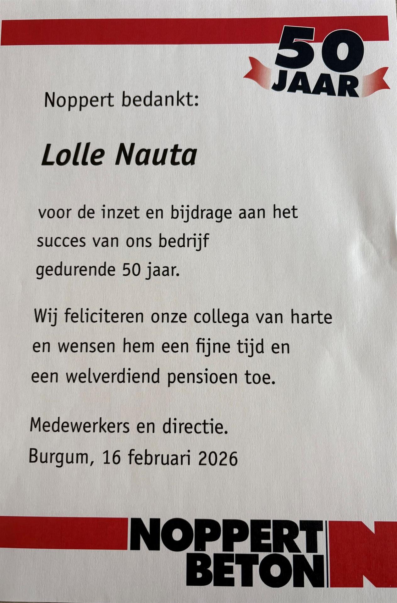 Op 16 februari 2026 staat een bijzondere mijlpaal centraal bij Noppert Beton. Op deze dag viert Lolle zijn indrukwekkende 50-jarig dienstjubileum. Een halve eeuw toewijding, vakmanschap en betrokkenheid – een prestatie die niet onopgemerkt voorbij mag gaan.
