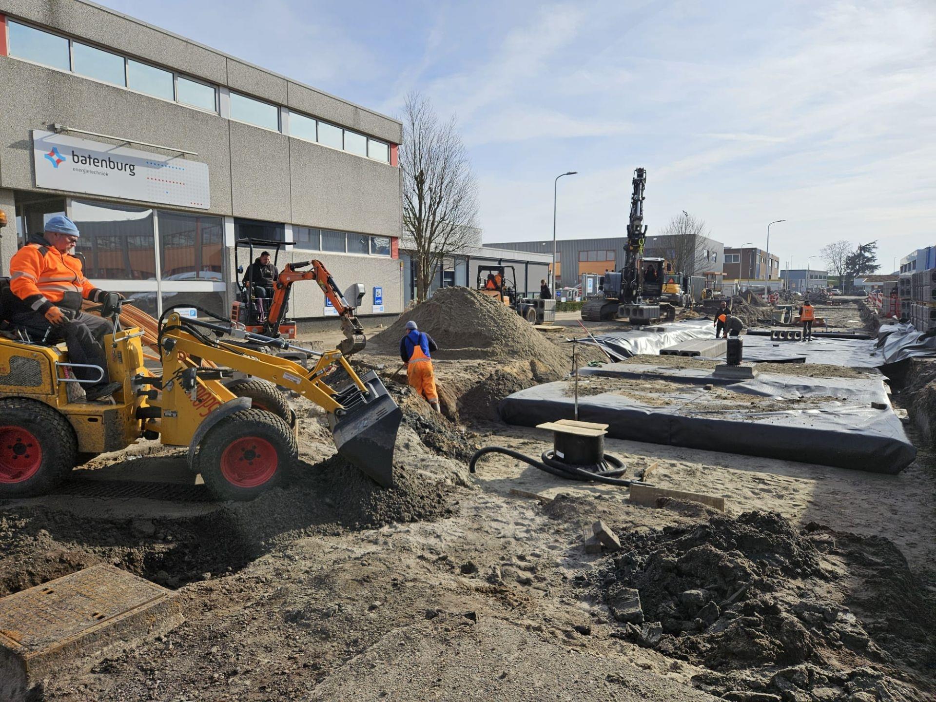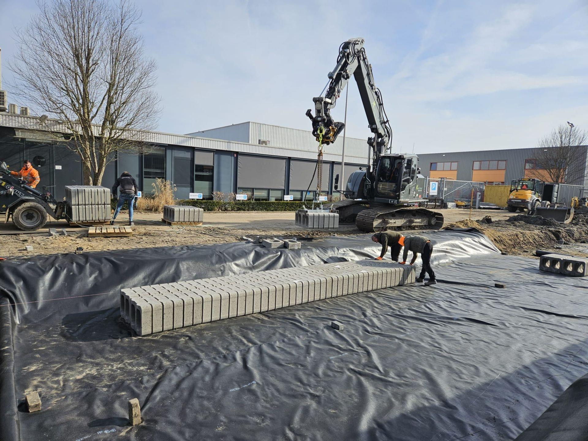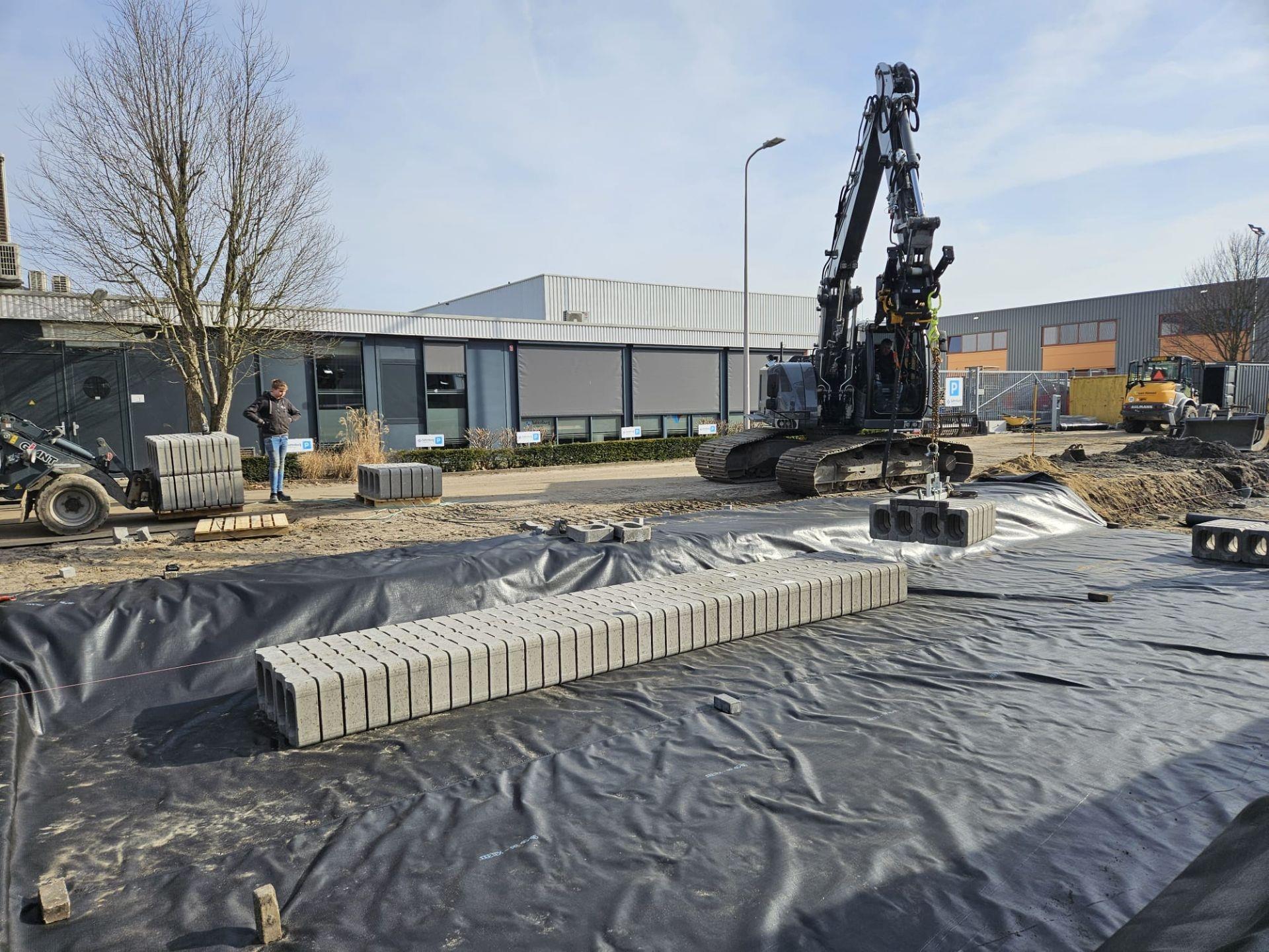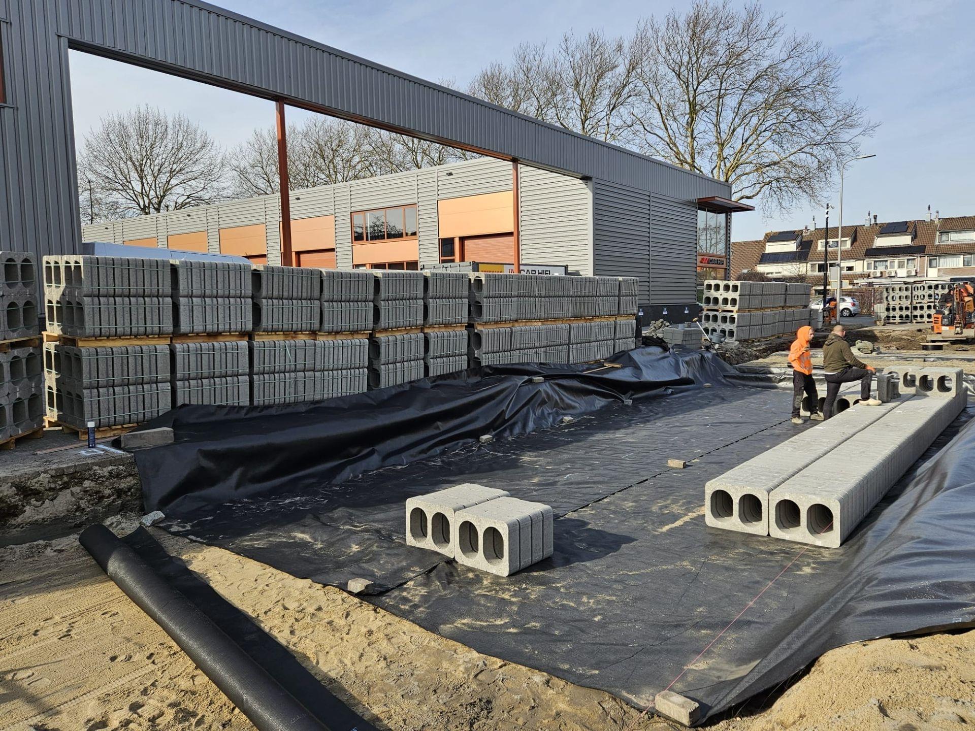 Onder de Kompasstraat ligt nu een indrukwekkend voorbeeld van die visie: een ondergrondse waterberging met maar liefst 26.000 beDrain-blokken, goed voor een capaciteit van circa 677 m³. Deze constructie vangt regenwater tijdelijk op tijdens piekbuien en voorkomt zo wateroverlast in de straat en de omliggende bedrijfspercelen.