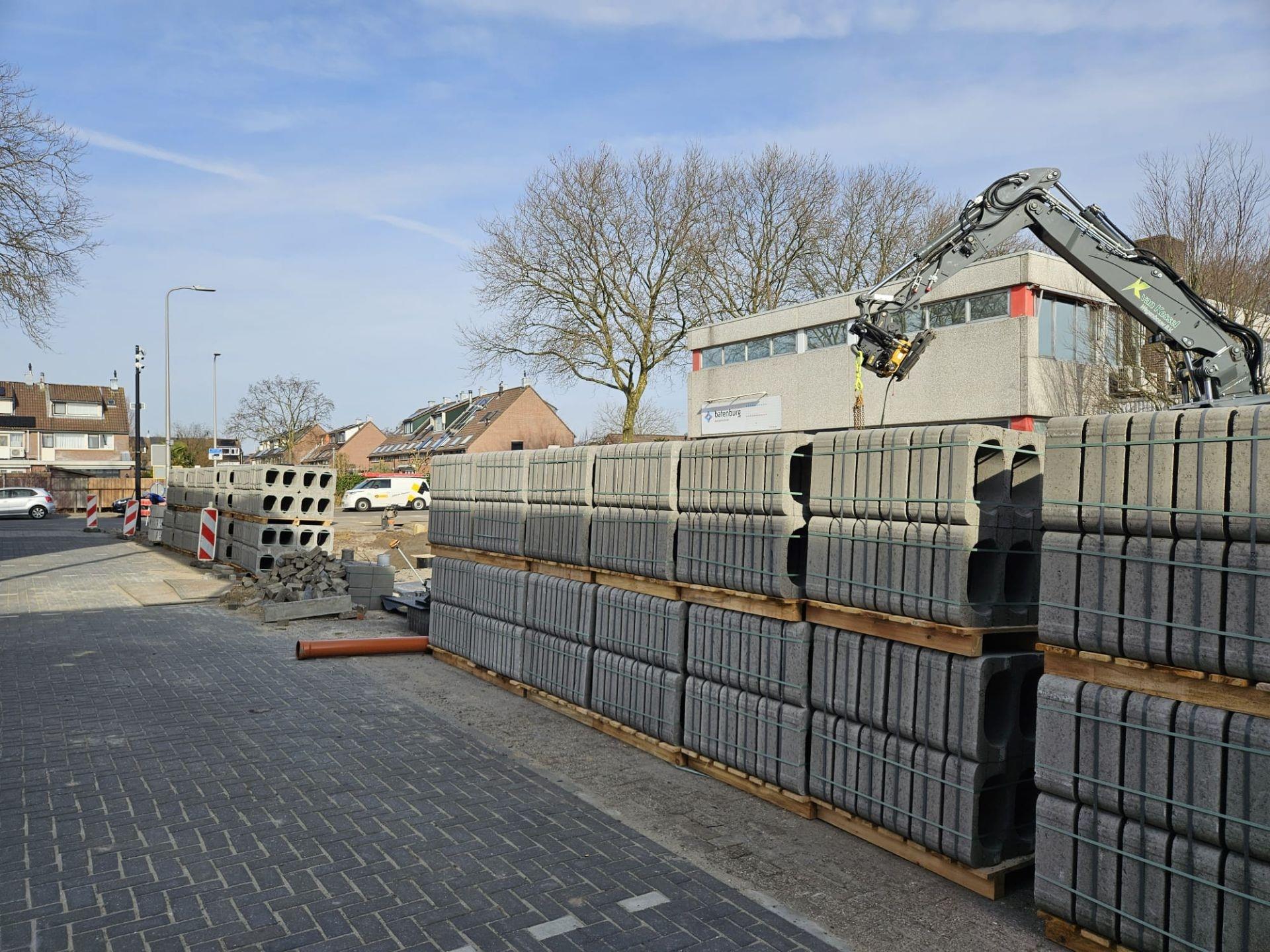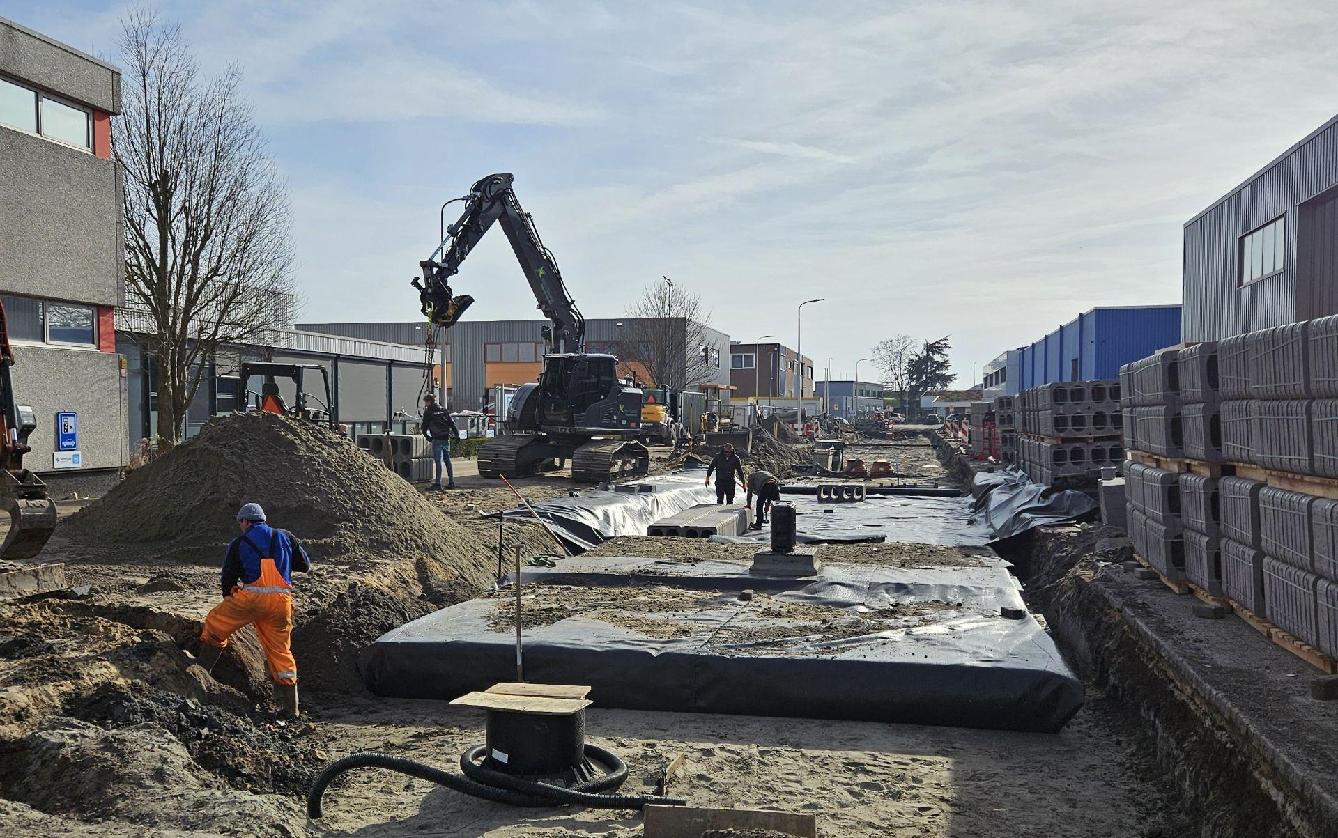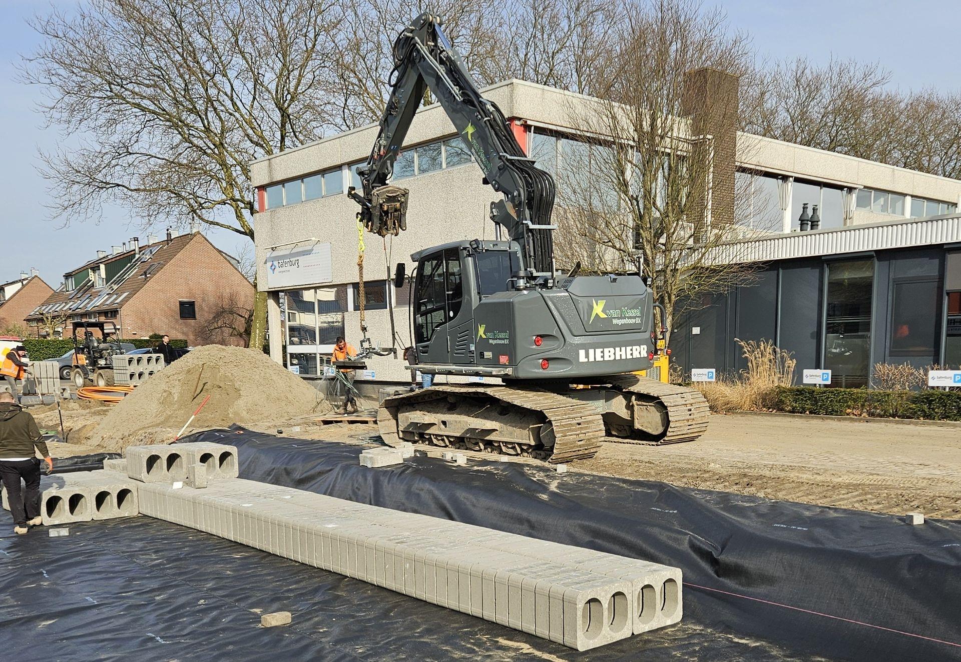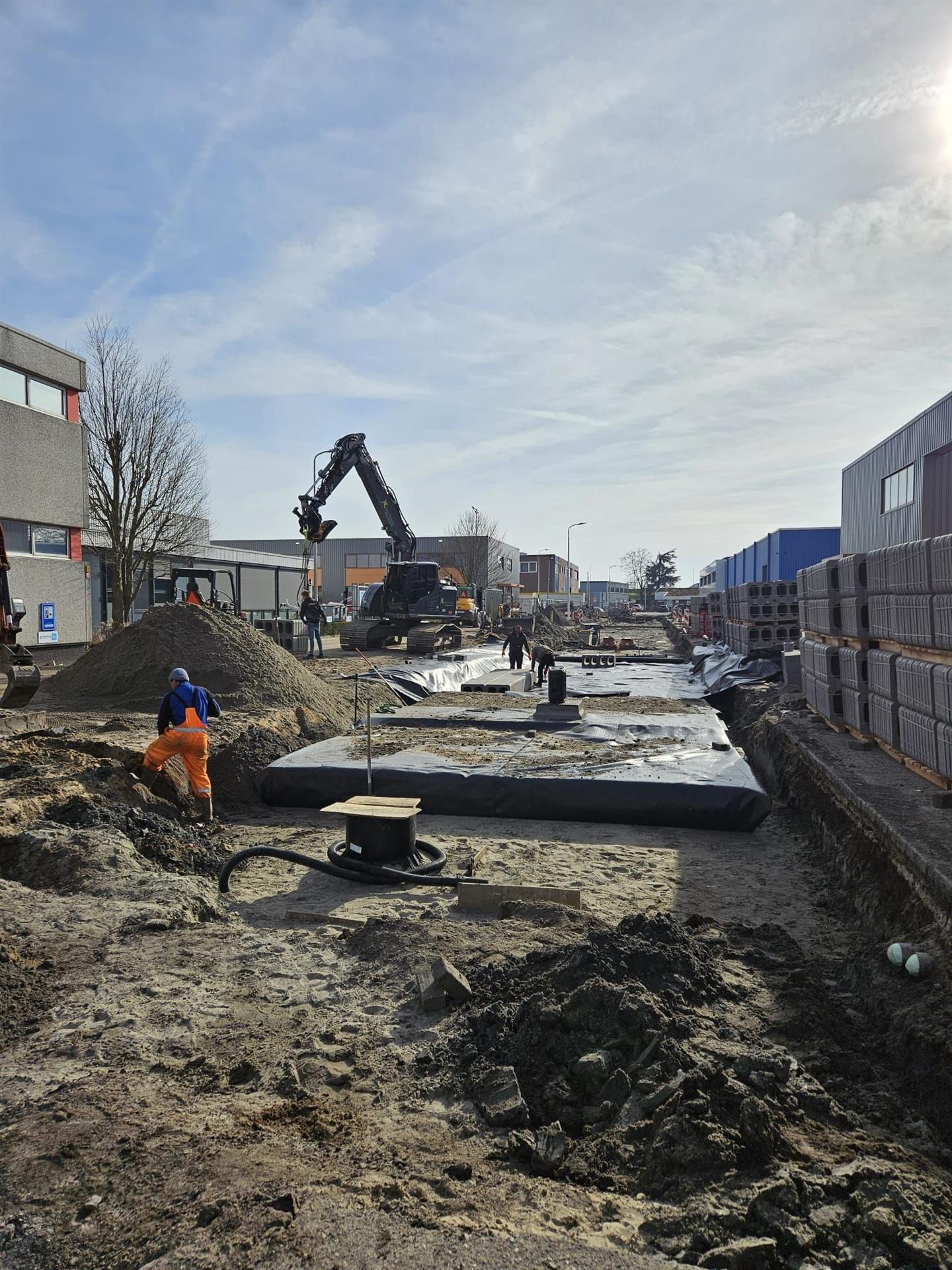 Onder de Kompasstraat ligt nu een indrukwekkend voorbeeld van die visie: een ondergrondse waterberging met maar liefst 26.000 beDrain-blokken, goed voor een capaciteit van circa 677 m³. Deze constructie vangt regenwater tijdelijk op tijdens piekbuien en voorkomt zo wateroverlast in de straat en de omliggende bedrijfspercelen.