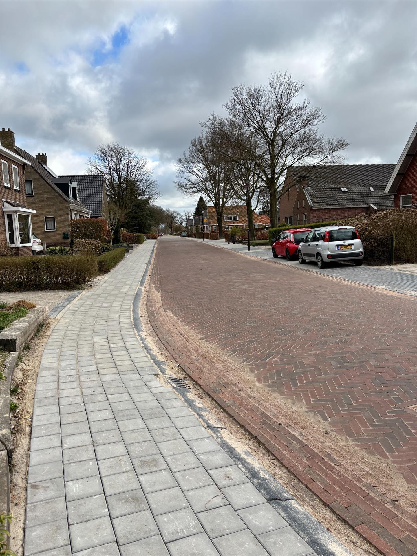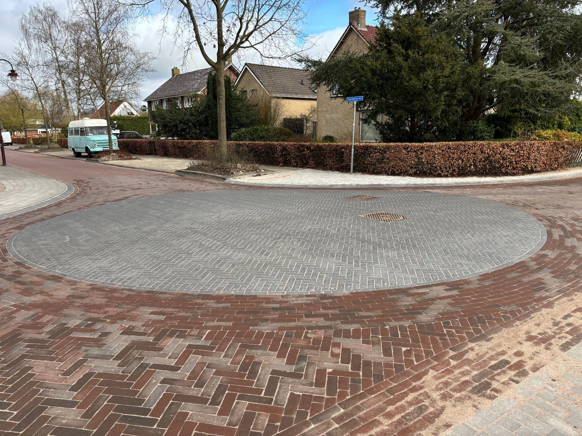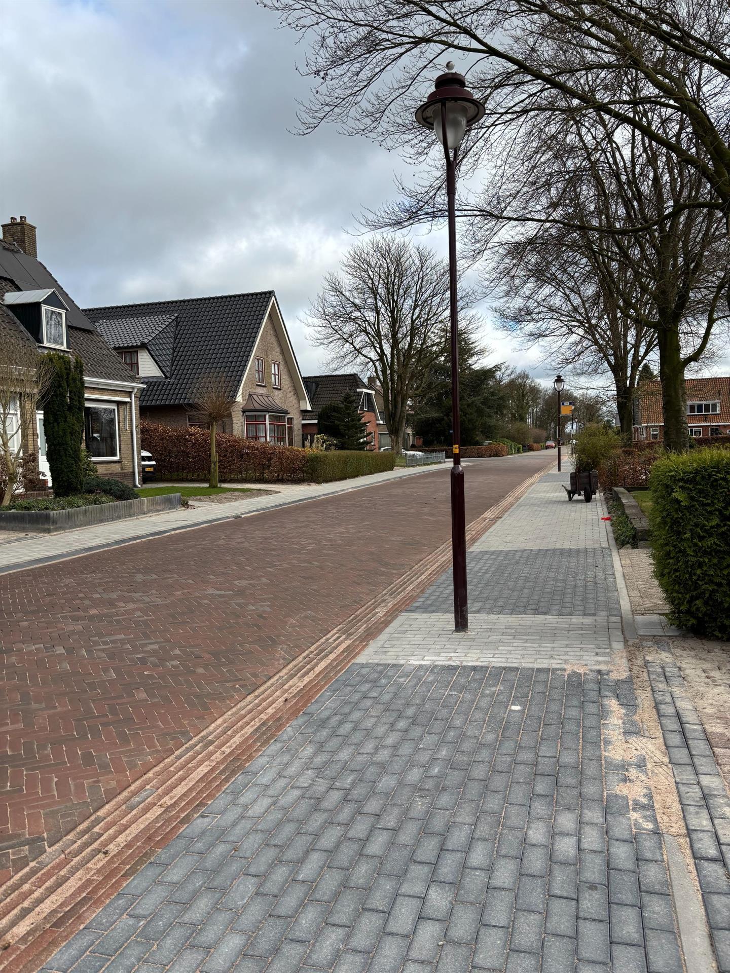 Voor de afwerking van de rijbanen is gekozen voor gebakken klinkers, die zorgen voor een duurzame en sfeervolle uitstraling passend bij het dorpsbeeld.
