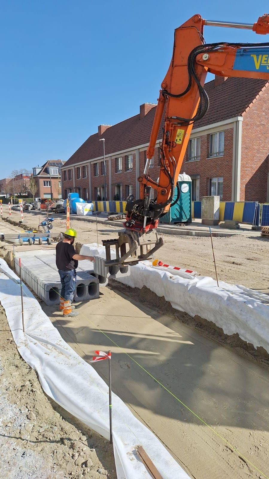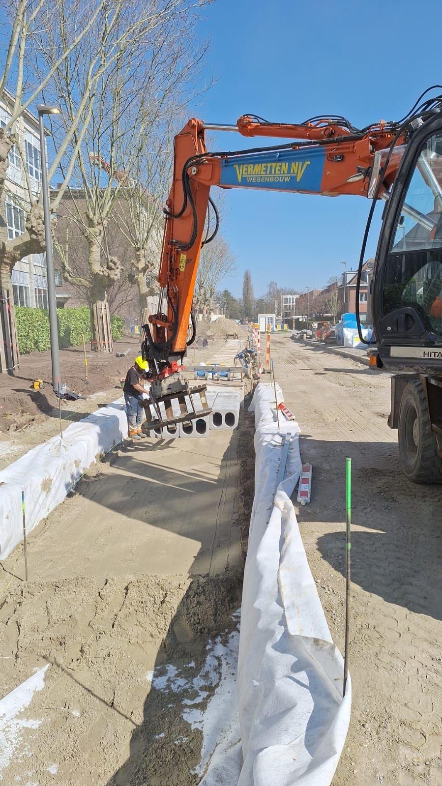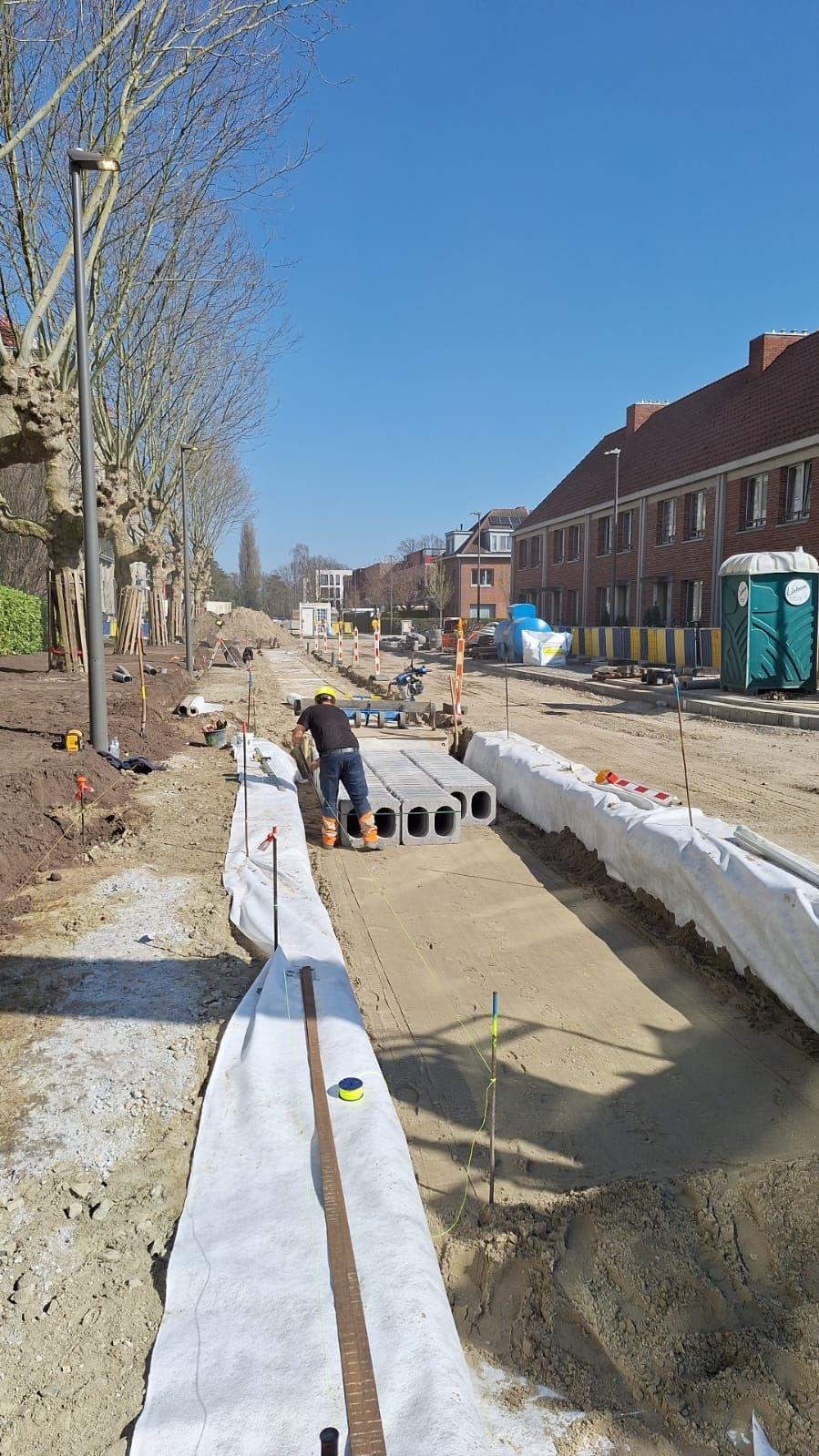 De herinrichting van de Salesianenlaan in Hoboken is een toonbeeld van hoe stedelijke infrastructuur slim kan omgaan met regenwater. Onder de parkeerzones langs de volledige straat werden maar liefst 6.200 beDrain Bufferblocks geplaatst. Deze betonnen infiltratieblokken liggen hoog in de ondergrond, waardoor de bovengrondse lagen optimaal gebruikt worden voor natuurlijke infiltratie van regenwater.