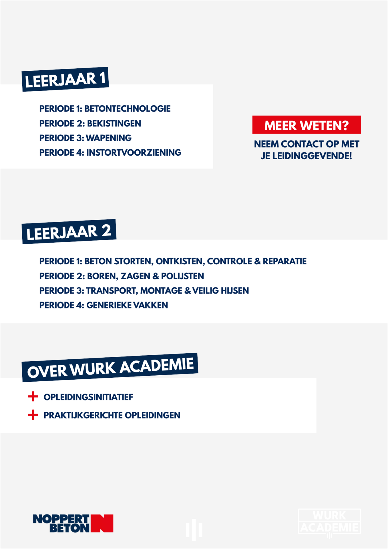 Werken én leren tegelijk: het is dé manier om praktijkervaring op te doen en jezelf te ontwikkelen tot een vakman of vakvrouw in de betonbouw. De combinatie van opleiding en werkvloer zorgt ervoor dat theorie direct wordt toegepast in de praktijk, precies zoals het vak bedoeld is.