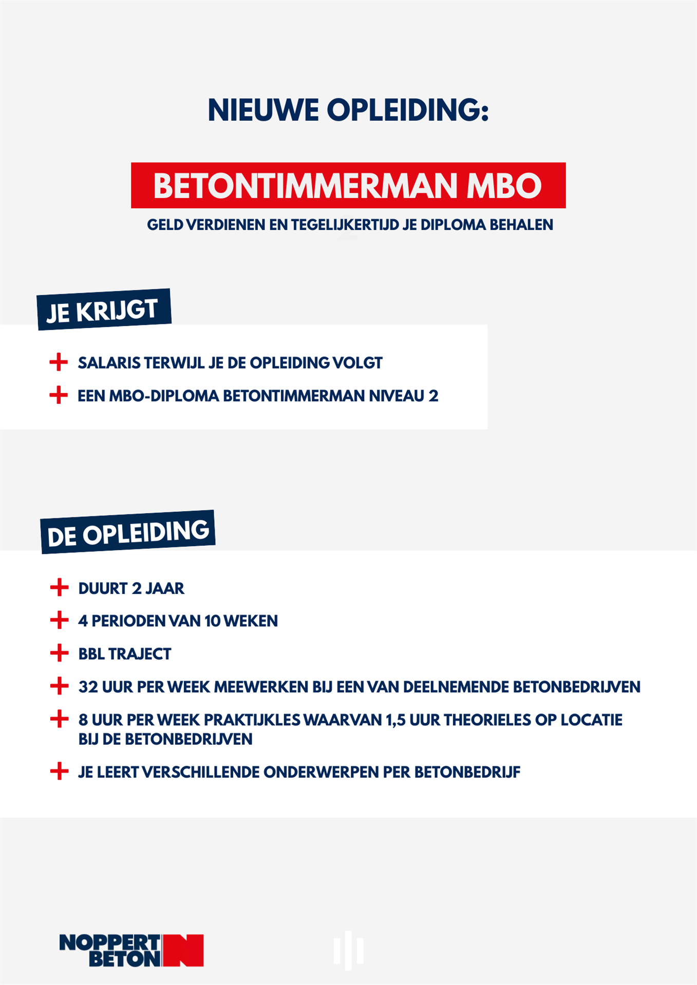 Bij Noppert Beton geloven we in leren door te doen! Daarom ondersteunen wij de BBL-opleiding Betontimmerman van harte.